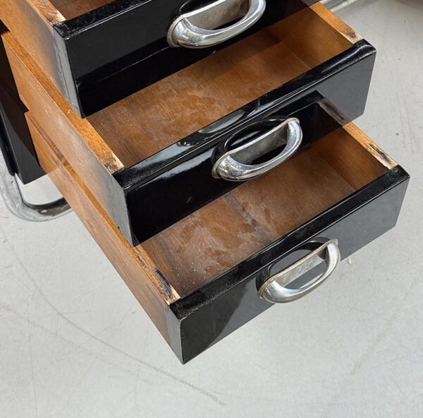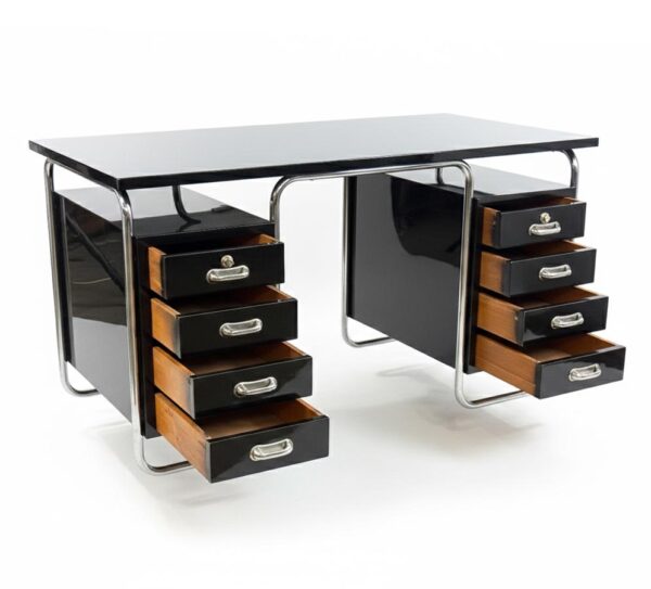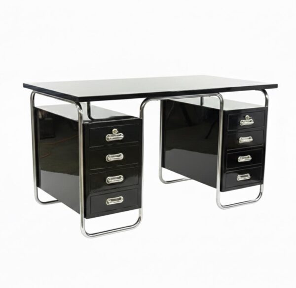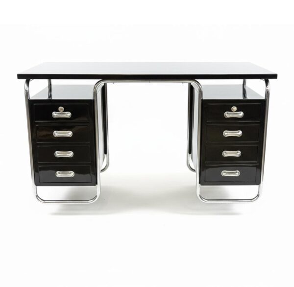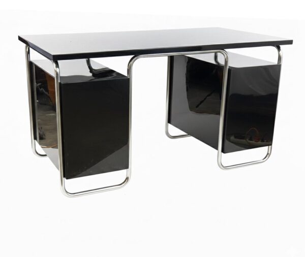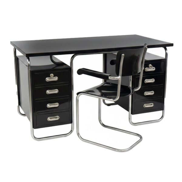 Funkcionalistický psací stůl s chromovou trubkovou konstrukcí, doplněný původním křesílkem.