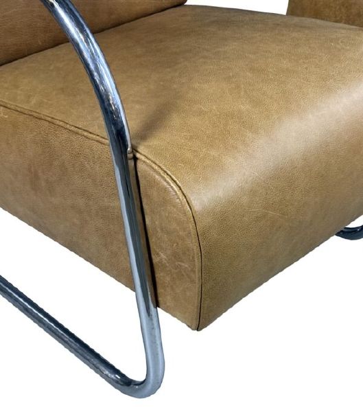 odborně restaurováno, nové čalounění s kompletně obnovenou výplní, dřevěné područky citlivě restaurovány a opatřeny lakem ve vysokém lesku. Chromovaná trubková konstrukce zůstává původní a nese přirozenou patinu doby.