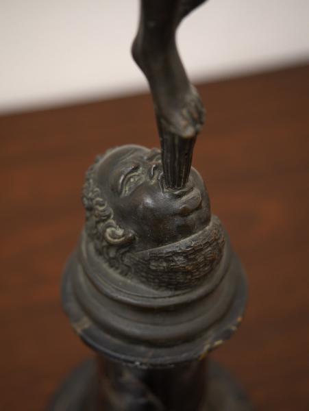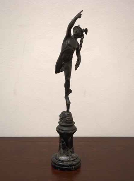 Elegantní bronzová socha Merkura z 19. století, vytvořená po vzoru slavného modelu Giambologna, představuje boha v dynamickém pohybu s typickými atributy antické mytologie. Postava je zpracována s důrazem na anatomii, lehkost a výraznou siluetu, která patří k nejoblíbenějším sochařským motivům inspirovaným renesančním uměním.