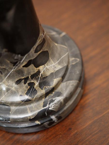 Socha stojí na kvalitním podstavci z luxusního italského mramoru Portoro Nero, ceněného pro svou hlubokou černou barvu a výraznou zlatavou kresbu. Spojení tmavě patinovaného bronzu a dekorativního mramoru dodává celku velmi reprezentativní a sběratelsky atraktivní charakter.