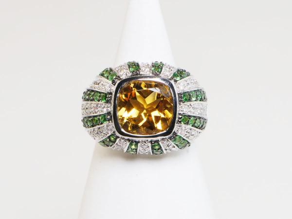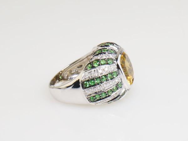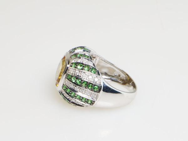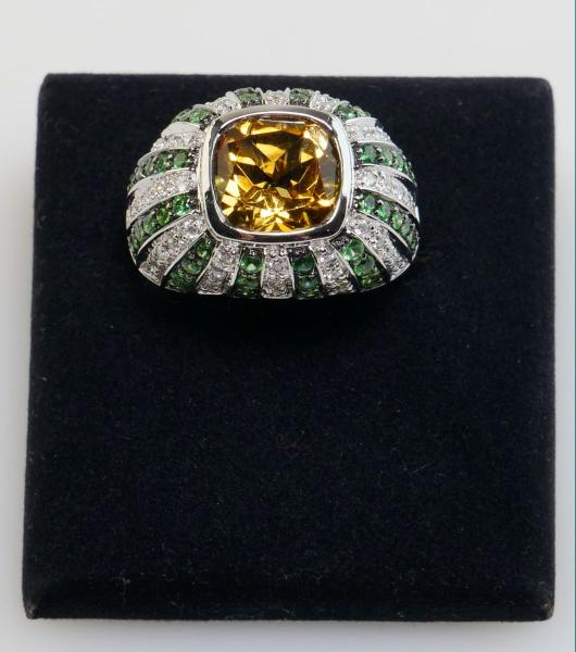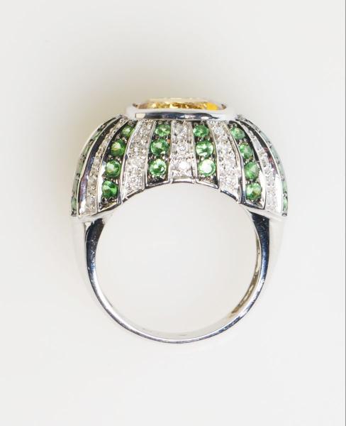zlatý prsten s citrínem, diamanty a demantoidy, Au btto 8,77 g/585/1000, citrín starého velmi dobrého briliantového brusu má hmotnost cca 3,7 ct, 54 diamantů briliantového brusu má hmotnost cca 0,54 ct, 52 namibijských demantoidů má celkovou hmotnost cca 1,04 ct, západní Evropa, kolem r. 2000, pozdější český punc (labuť), rozměry 25,7 x 22,8 x16,7 mm; znalecký posudek; velikost prstenu 54