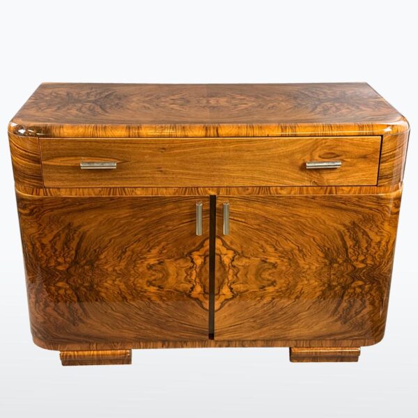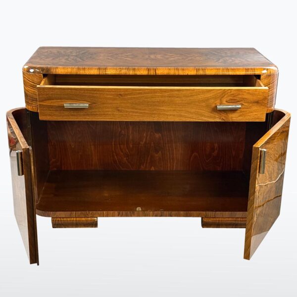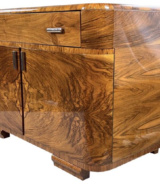 Komoda je odborně restaurována, povrch kvalitním polyuretanovým lakem ve vysokém lesku.