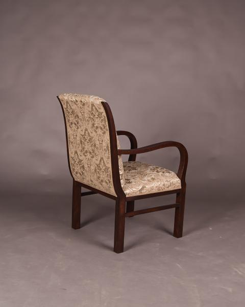 Tato elegantní dvojice křesel představuje kvalitní ukázku meziválečného nábytkového designu v duchu Art Deco. Tvarosloví je založeno na čistých, plynulých liniích a vyvážených proporcích, kde područky přirozeně navazují na konstrukci nohou a vytvářejí kompaktní, harmonický celek.