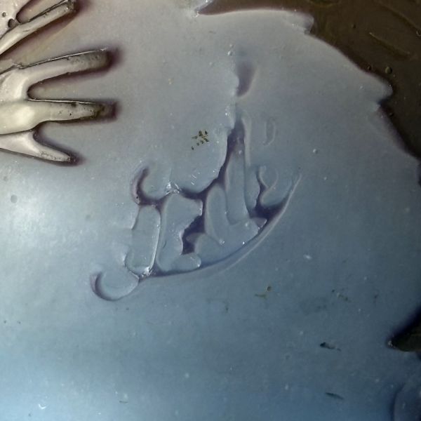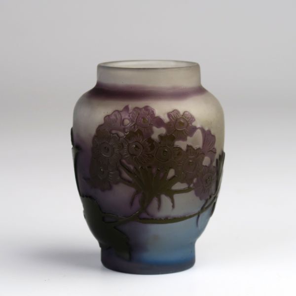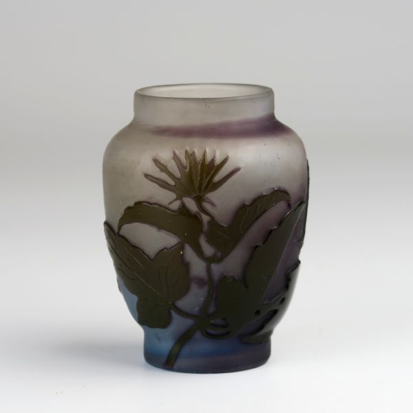 1. čtvrtina 20. století, sklo čiré, vrstvené fialovým, odleptávaný květinový dekor, odleptávaná značka Gallé, 980-3