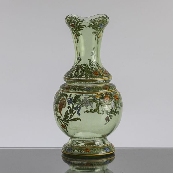 kolem 1890, severní Čechy, světle zelené sklo, malba rozvilin v renesančním stylu pestrými emaily, výška 30 cm, 990-1