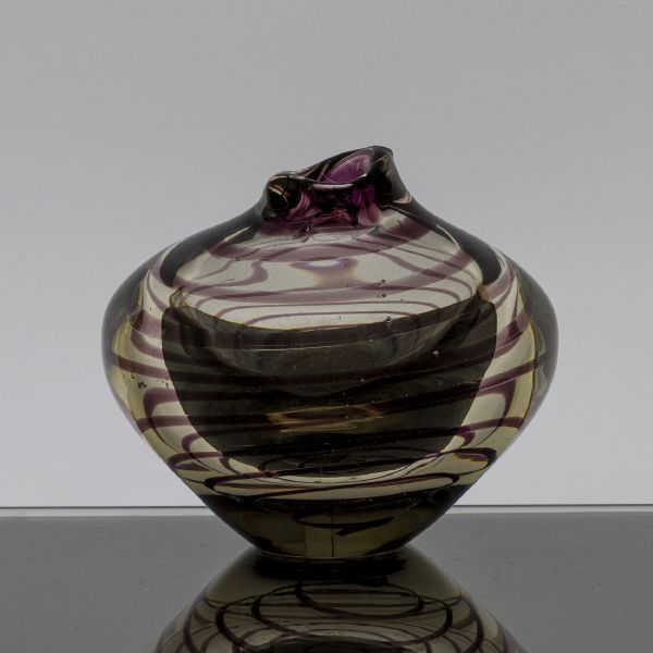 Váza, kolem 1955, pravděpodobně sklárna Škrdlovice, sklo čiré se zatavenou fialovou spirálou, hutně tvarováno, rytě značeno 5522 MV, 990-4