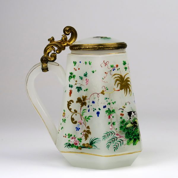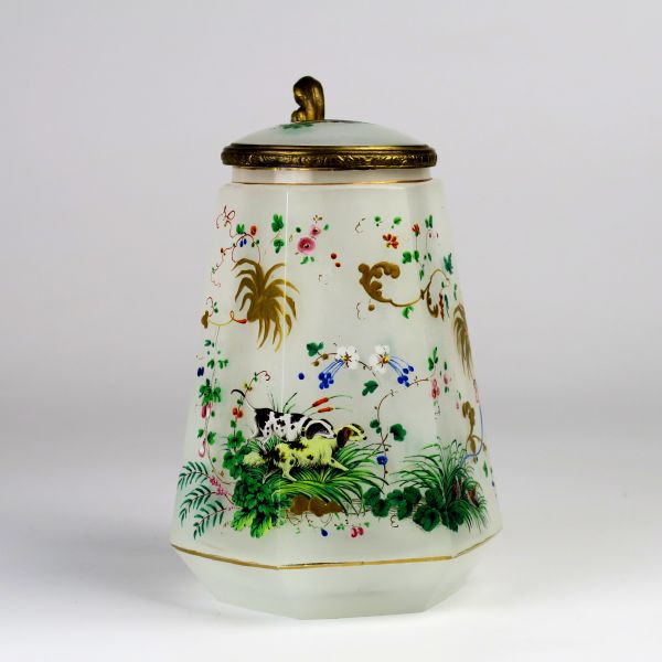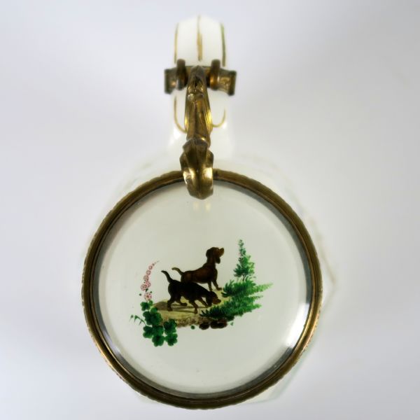 kolem 1850, jižní Čechy, sklo kostní, fazetovaný tvar, pestrá malba psů v krajině, zlaceno, mosazná montáž, výška 17 cml, 990-5