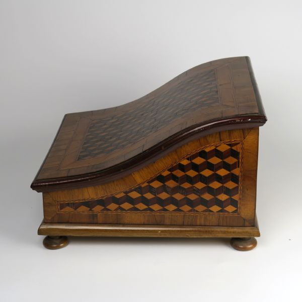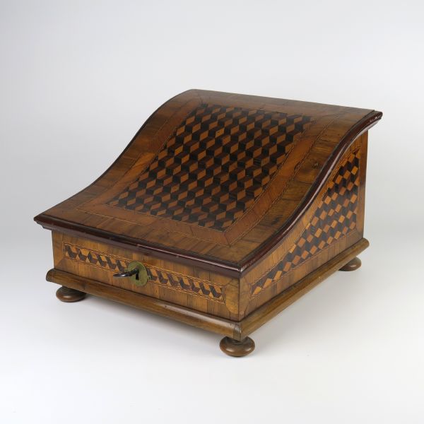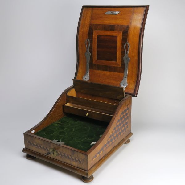 konec 18. století, Čechy, dřevo, dýhováno ořechovou dýhou, bohatě geometricky intarzováno, esovitě prohlá odklopná deska, uvnitř drobné zásuvky, funkční zámeček s klíčem, vloženy sametová plata na sbírku mincí, 994-9