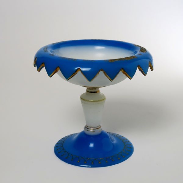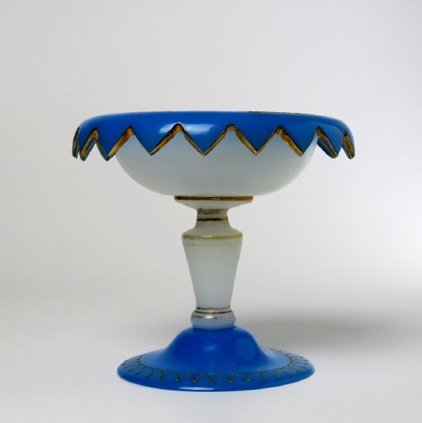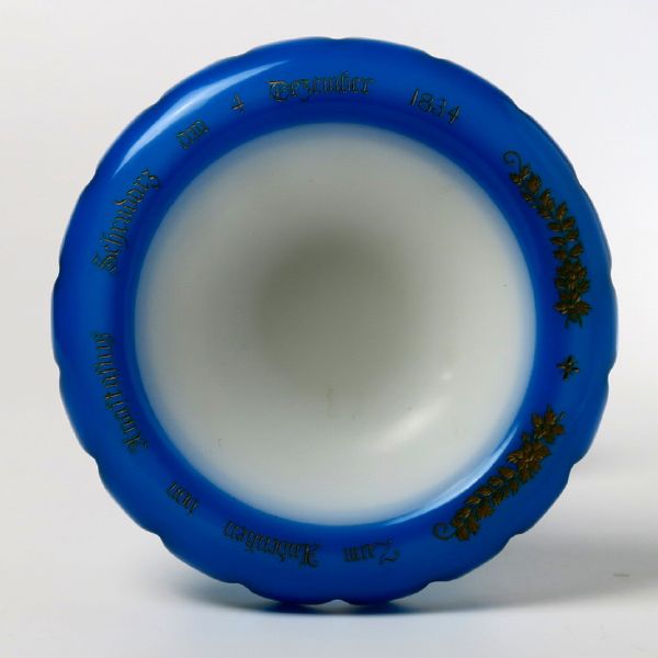 1834, Čechy, sklo opálové bílé a modré, broušený a zlacený dekor a nápis "Zum Andenken von Anastasius Schrudarz am 4 Dezember 1834, výška 14,5 cm, průměr 16,5 cm, 1000-15