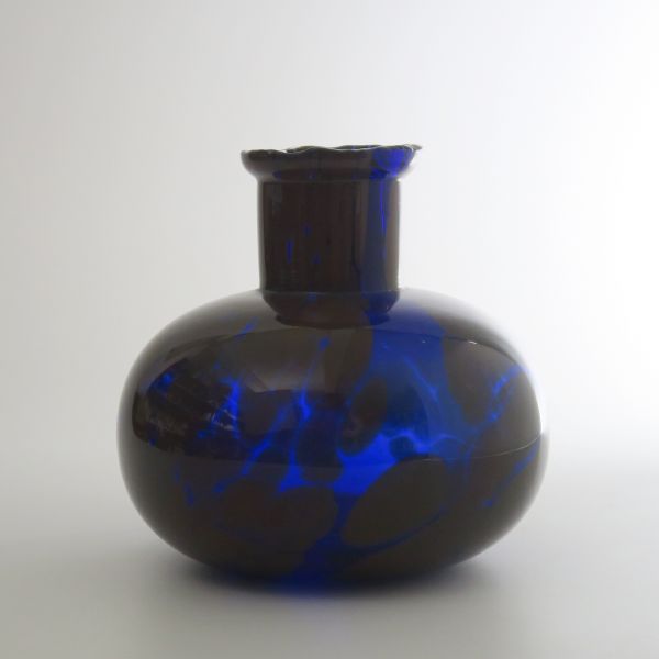 Váza, návrh 1973, číslo modelu 12871, sklo kobaltově modré, zatavené okrové broky, sklárna Chlum u Třeboně, drobná odchylka od sériové produkce - nepravidelně zatavené hrdlo, výška 17 cm. Pravděpodobně autorský prototyp pro pozdější sériovou produkci, 1005-3