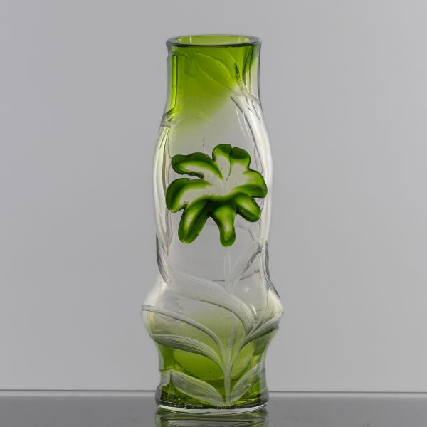 počátek 20. století, Moser, Karlovy Vary, sklo čiré sbíhané do zeleného, hluboce řezaný motiv stonku se zeleně intarzovaným květem lilie, rytá značka Moser Karlsbad, 1006-4