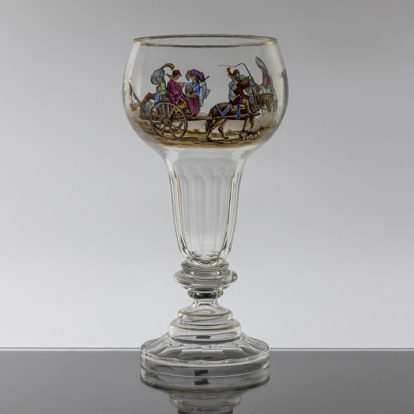 po 1920, Julius Mühlhaus, Nový Bor, sklo čiré, pestře malované motivy poutníků v krajině ve stylu 17. století, broušené fazety, zlaceno, výška 32,5 cm, 1008-4