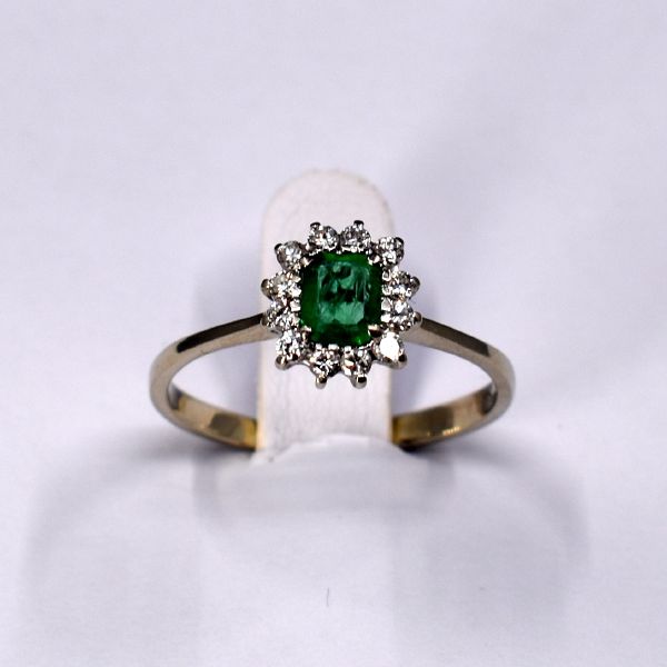750/1000, v. 2,40 g, brilianty moderního brusu celkem cca 0,24 ct, smaragd tabulkového brusu, čs. punc, velikost 60, 1016-8