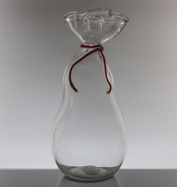 připsáno, Pytel, sklo čiré, foukané, hutně tvarované, natavená červená skleněná mašle, 1017-3