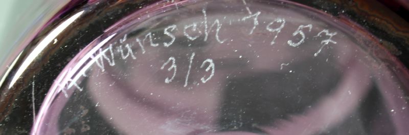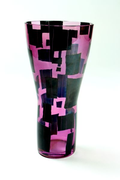 Váza s abstraktním motivem, 1957, sklo čiré, lazurované a domalované černou barvou, ryté, vzácně se vyskytující autorská práce, signováno, datováno a číslováno K. Wünsch 1957 3/3, Prov.: získáno z pozůstalosti autora, výška 22 cm, 1022-2