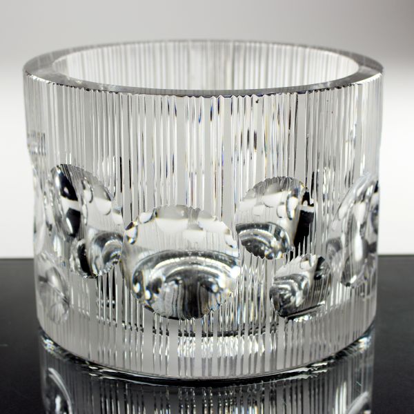 Masivní váza, návrh 1977, olovnatý křišťál, broušený s vybroušenými čočkami, model č. 425/6852, sklárny Bohemia Poděbrady, provoz Úsobí, signováno, Lit.: CGG - Glass Review.1978/10, s.12, obr. 9, výška 16 cm, průměr 22 cm, 1022-13