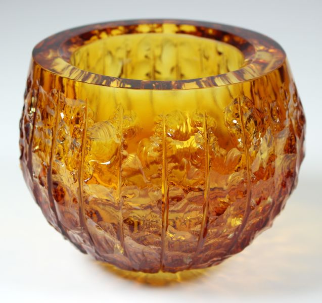 Masivní miska, 2025, autorská práce, unikát, signováno a datováno, sklo ambrové se sekaným dekorem, leštěné výška 14 cm, průměr 17 cm, Prov.: ateliér autora, 1022-30