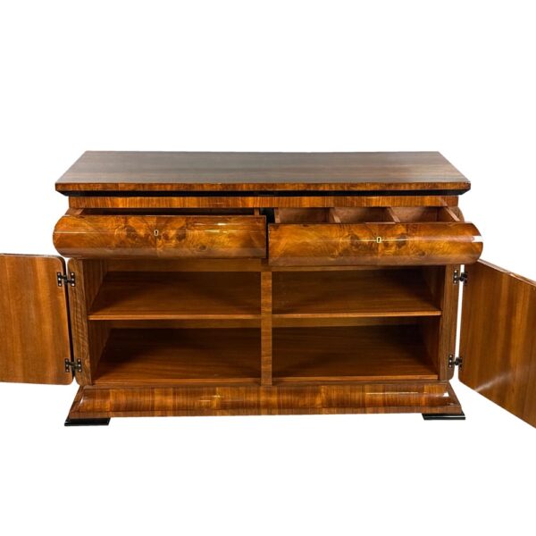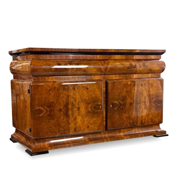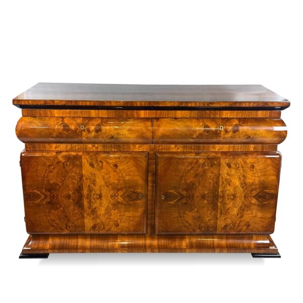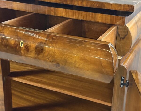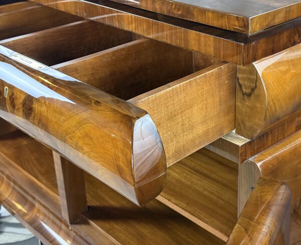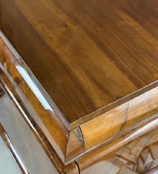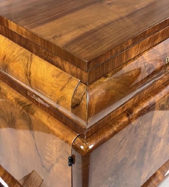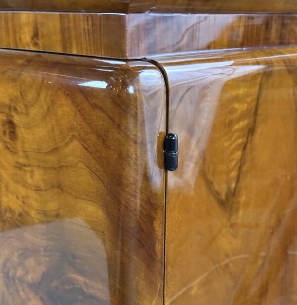 ořechová dýha, odborně restaurováno do vysokého lesku polyuretanovým lakem, zámky jsou funkční včetně klíčů