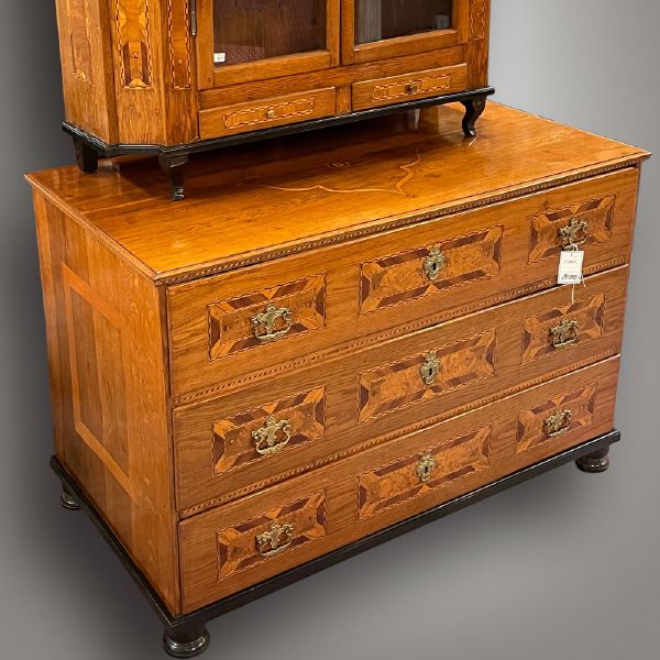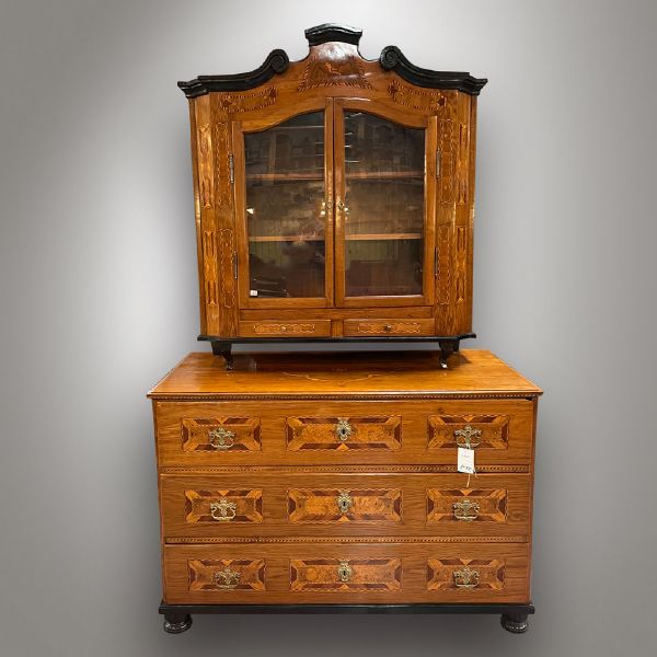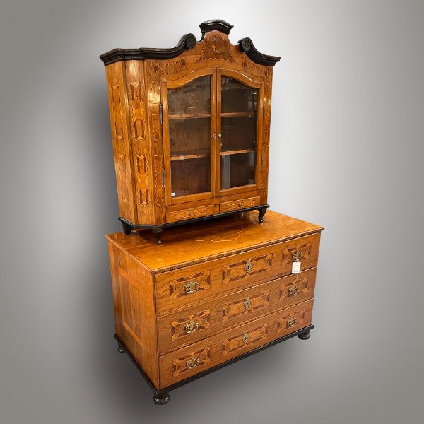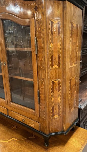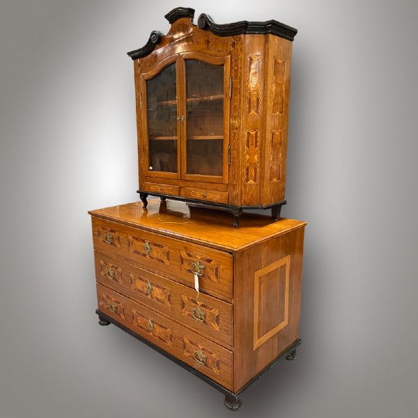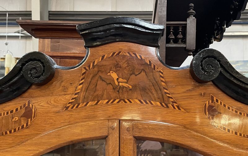 ořech, třešen, bříza, dub, sklo, mosaz, bohatě intarzováno, mosazné kování, restaurováno šelakovou politurou