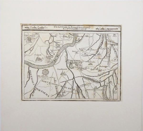 Německo, Augsburg 1704-1720. Mědirytina na papíru 17,5 cm x 23,3 cm. Značeno vpravo dole: G. Bodenehr, fec et Excudit. Nahoře nápis: GUASTALLA s doplňujícími údaji. Ze slavné knihy Gabriel Bodenehr - Europeans Macht und Pracht, ze série rytin zobrazujících pohledy na evropská města, jejich plány, pevnosti a hrady. Autor: Gabriel Bodenehr starší (1664-1758) byl německý kartograf a člen slavné rytecké a vydavatelské rodiny z Augsburgu. Jeho hlavním dílem byl ”Atlas Curieux oder neuer und compendieuser Atlas” vydaný poprvé roku 1704. Celkový rozměr s paspartou 30 cm x 33 cm. Nerámováno. Z umělecké sbírky Ladislava Šalouna.