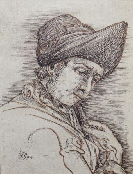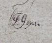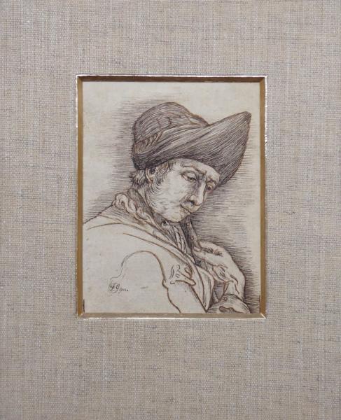 Evropa, 19. století. Kresba tuší na papíru 13,5 cm x 11,5 cm. Značeno vlevo dole: G. GOYA. Celkový rozměr s paspartou 22,5 cm x 18 cm. Pasparta potažená textilií se stříbrnou ořízkou. Nerámováno. Z umělecké sbírky Ladislava Šalouna.