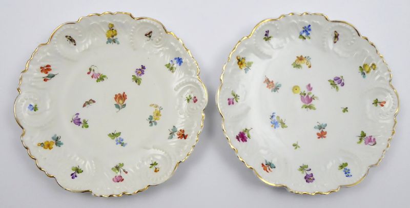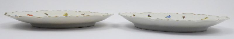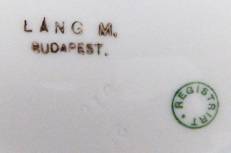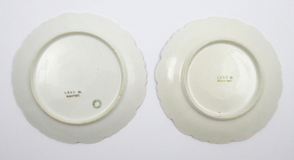 MALBA MIHÁLY LANG, BUDAPEŠŤ, Čechy, Klášterec nad Ohří a Budapešť 1880 - 1895. Bílý, ručně barevně malovaný a zlacený porcelán. Talíř z porcelánky Klášterec a ruční malba Lang Mihály, Budapešť. Tento malíř porcelánu působil v 80. letech 19. století i ve slavné porcelánce Herend. Párové dekorativní i dezertní talířky s reliéfně prolamovaným zlaceným okrajem. Ručně malované drobným různobarevným kvítím a motýlky. Značeno zespodu: vtlačené TK a čísla, tištěné LANG M BUDAPEST a REGISTRIRT.