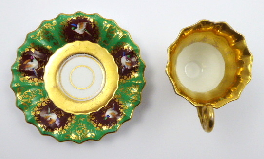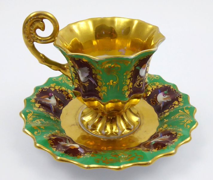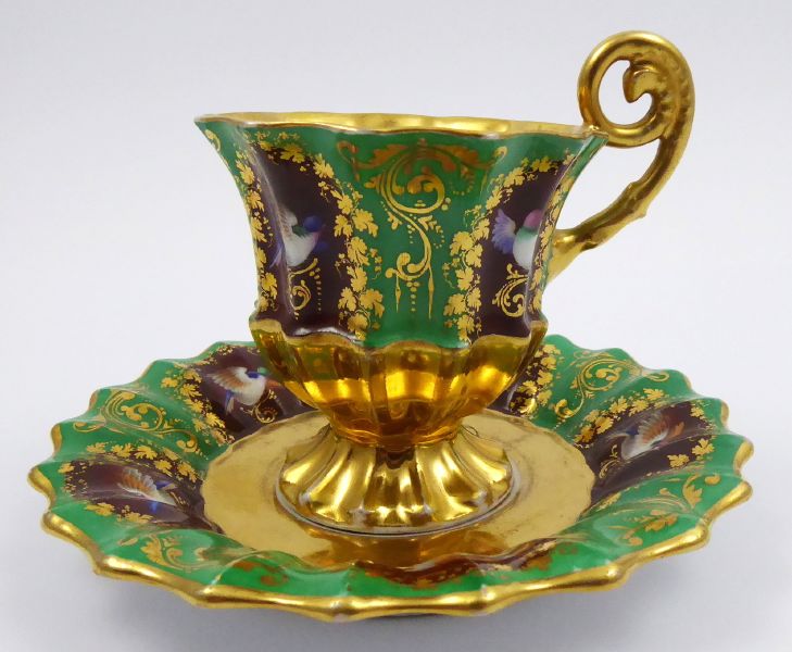 - BŘEZOVÁ, FISCHER & REICHENBACH Čechy, Březová (Pirkenhammer) 1820 - 1846. Bílý, ručně barevně malovaný a zlacený porcelán. Porcelánka Fischer & Reichenbach, Pirkenhammer. Výška šálku 10 cm, průměr podšálku (misky) 15 cm. Luxusní koflík s reliéfně prolamovaným designem a vyvýšeným úchytem. Silně zlacený a ručně dekorovaný medailony s různými druhy ptačích opeřenců v letu doplněnými o zlacené florální ornamenty. Sběratelsky zajímavý kousek. Značeno zespodu: vtlačená písmena F & R.