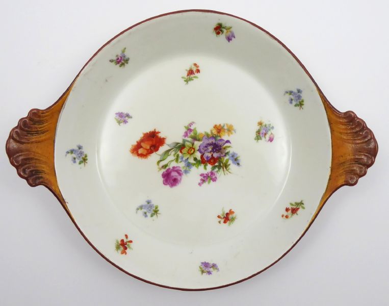Bílý, barevný a zlacený porcelán. Horní linka se zbytky zlacení. Mistička...