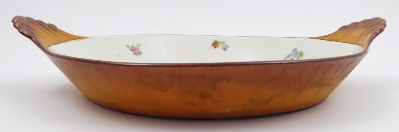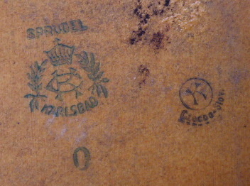 - CARL KNOLL, RYBÁŘE U KARLOVÝCH VARŮ, Čechy, Rybáře u Karlových Varů 1900 - 1930. Smetanově bílý a barevný porcelán. Carl Knoll, Rybáře u Karlových Varů. Průměr 30,5 cm. Mísa z bílého porcelánu s jemně reliéfními úchyty okrové barevnosti zdobená na vnitřní straně květinovými vazbami a jednotlivými barevnými kvítky. Značeno zespodu: firemní tištěná značka, značka s nápisem KARLSBAD SPRUDELL a číslo.