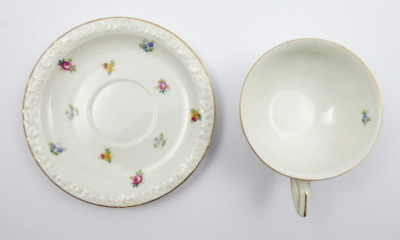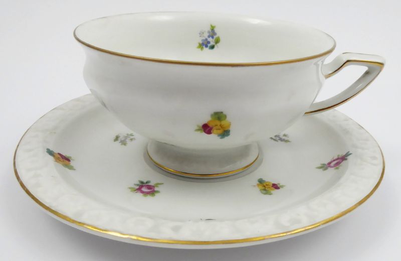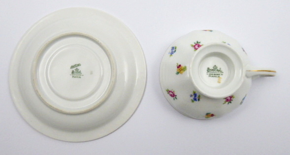 ČAJOVÝ ŠÁLEK S KVĚTINOVÝM VĚNEČKEM - ROSENTHAL, MARIA Německo, Selb 1930 - 1931. Bílý, barevný a zlacený porcelán. Autor návrhu: Philipp Rosenthal (1855-1937). Název modelu: Maria. Porcelánka Rosenthal. Výška šálku 5,5 cm, průměr podšálku 16 cm. Čajový šálek s podšálkem zdobené jemným reliéfním ornamentem, zlacenými linkami a barevnými svazečky lučního kvítí. Značeno zespodu: firemní značka Rosenthal, SELB - BAVARIA, MARIA a zlacenými čísly.