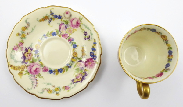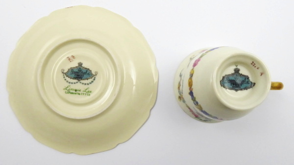 - ROSENTHAL, IVORY, LINNIE LEE, Německo, Rosenthal 1947 - 1948. Slonovinový, barevný a zlacený porcelán. V anglickém stylu. Rosenthal, Ivory, Linnie Lee, patent No. 77718. Tato série byla určena výhradně pro americký trh. Výška šálku 6 cm, průměr podšálku 12 cm. Reprezentativní kávový šálek s podšálkem v anglickém stylu. Z porcelánu slonovinové barevnosti zdobený květinovými věnečky vně i uvnitř šálku. Značeno zespodu: originální značka Rosenthal, IVORY, Linnie Lee, U. S. Patent No. 77718 a malířská značka i čísla.
