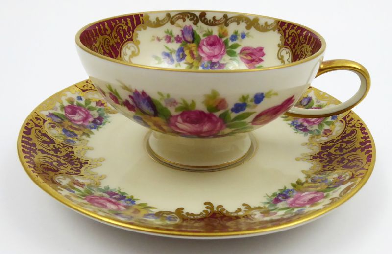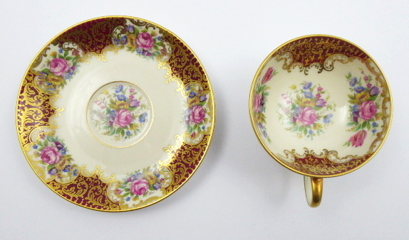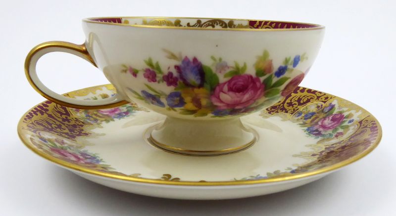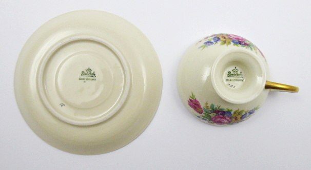 - ROSENTHAL, Německo, Rosenthal, 40. léta minulého století. Slonovinový, karmínový, barevný a zlacený porcelán. Porcelánka Rosenthal. Výška šálku 4,5 cm, průměr podšálku 11,5 cm. Kávový šálek slonovinové barevnosti miskovitého tvaru na kulaté nožce. Šálek i podšálek zdoben karmínovými poli střídajícími se s květinovými ornamenty. Doplněno zlacením. Značeno zespodu: firemní značka odpovídající danému období a čísla.