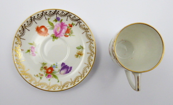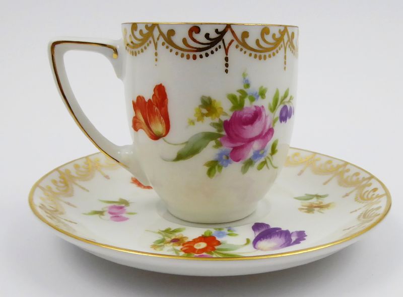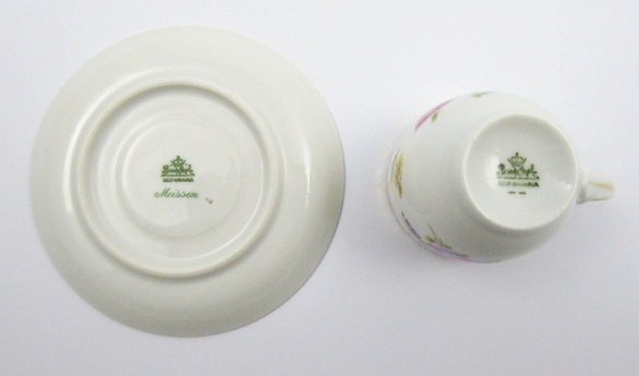 - ROSENTHAL, VZOR MEISSEN, Německo, Rosenthal 1920 - 1932. Bílý, barevný a zlacený porcelán. Porcelánka Rosenthal. Název vzoru: Meissen. Výška šálku 6 cm, průměr podšálku 11 cm. Elegantní kávový šálek z bílého, barevného a zlaceného porcelánu. Dekorovaný barevnými květinovými vazbami, zlacenými girlandami a linkami. Značeno zespodu: dvě firemní značky platné pro dané období, název vzoru Meissen a číslo.