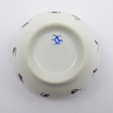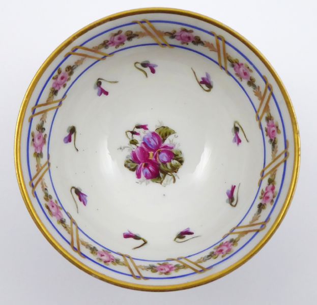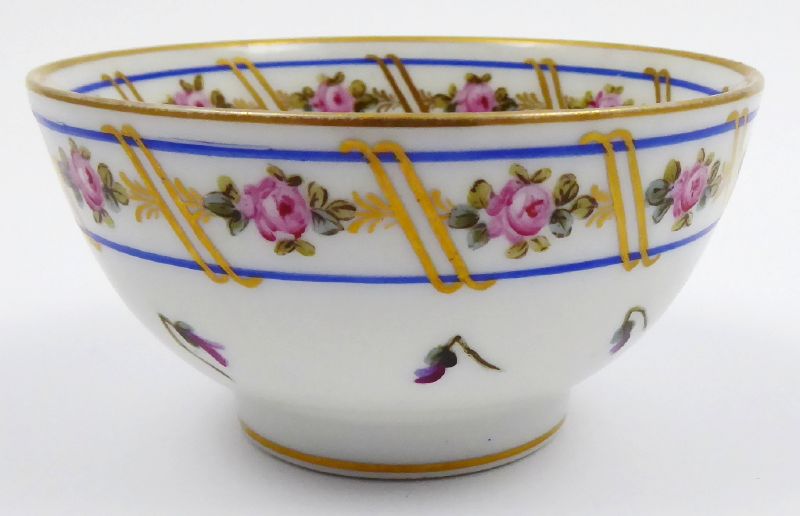 - EDMÉ SAMSON, PARIS, Francie, Paříž, od roku 1871. Bílý, barevný a zlacený porcelán. Edmé Samson, Paris. Ve stylu Sevres. Výška 5 cm, průměr 9 cm. Miska z bílého porcelánu dekorovaná pásem barevných kytiček se stuhami ohraničenými modrými linkami. Ručně malované zlacení horního i dolního okraje misky. Značeno zespodu: kopie značky Sevres.