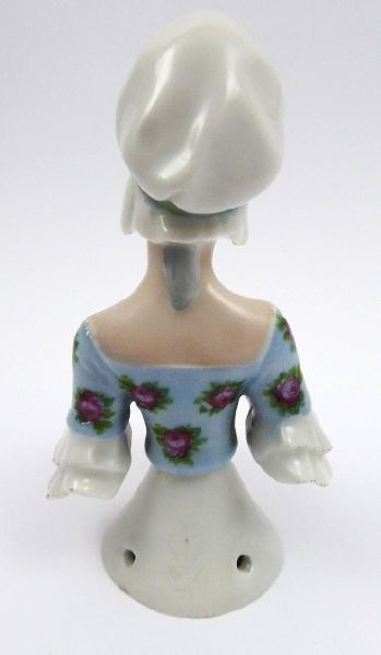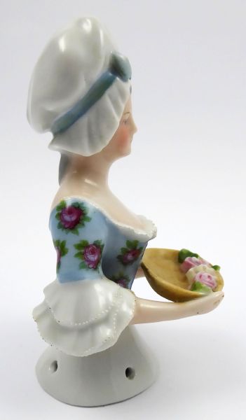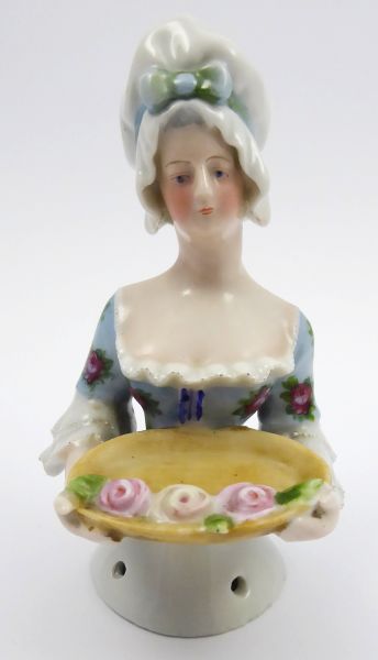 - WILLIAM GOEBEL, OESLAU Německo, Oeslau 1880 - 1920. Bílý a barevný porcelán, ruční domalba. Porzellanfabrik Oeslau und Wilhemsfeld založená roku 1871 Williamem Goebelem. Výška 13 cm. Porcelánová polopostava dívky ve vysokém čepci s hlubokým dekoltem a s podnosem růží v rukách. Obličej dívky ručně malovaný. Tzv. čajová panenka, jež sloužila jako ozdobný kryt a čajovou konvici. Na konci trupu dívky dírky k přišití látkové sukně. Zajímavý sběratelský kousek. Značeno zespodu.