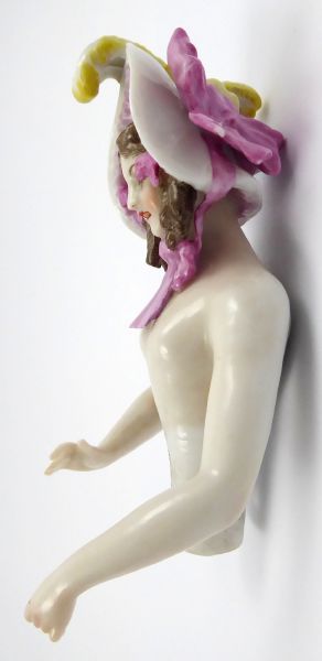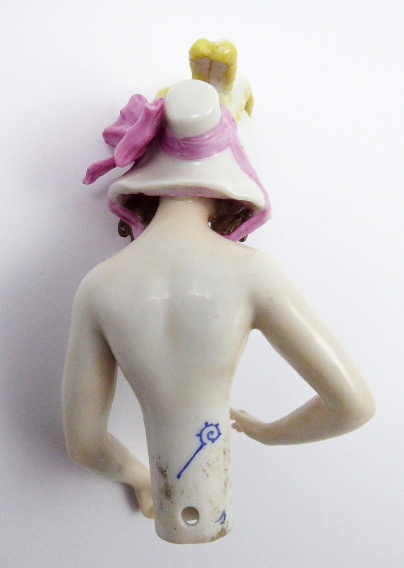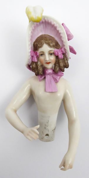 - PASSAU, DRESSLER, KISTER & CO., Německo, Passau 1907 - 1922. Bílý a ručně barevně malovaný porcelán. Porcelánka Dressler, Kister & Co., Passau (Pasov). Výška 13 cm. Porcelánová polopostava dívky ve vysokém klobouku s růžovými mašlemi a peřím. Obličej dívky ručně malovaný. Tzv. čajová panenka, jež sloužila jako ozdobný kryt na čajovou konvici. Na konci trupu dívky dírky k přišití látkové sukně. Zajímavý sběratelský kousek. Značeno zespodu: modrá biskupská hůl (berla).