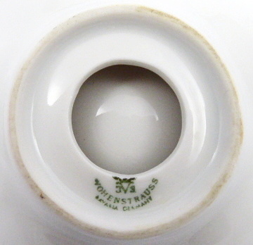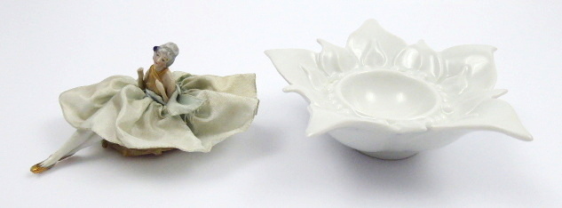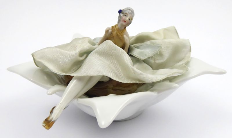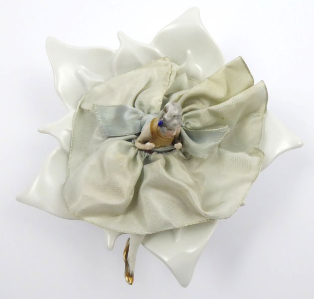 - JOHANN SELTMANN VOHENNSTRAUSS, Německo 1920 - 1940. Bílý, ručně barevně malovaný a zlacený porcelán, látka. Významná bavorská porcelánka Johann Seltmann Vohennstrauss. Průměr misky 16 cm. Ojedinělá porcelánová miska ve tvaru stylizovaného květu s rozevřenými okvětními lístky s látkovým víkem korunovaným porcelánovou figurkou dívky v široké sukni. Dívčin obličej i vlasy ručně barevně malované. Střevíce zlacené. Nádobka v misce sloužila buď na drahý šperk či pudr. Zajímavý sběratelský kousek. Značeno zespodu: firemní značka pro dané období.