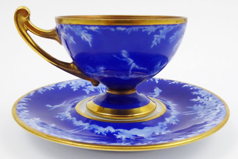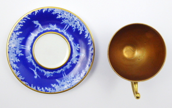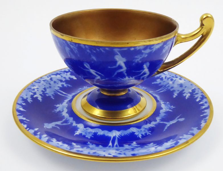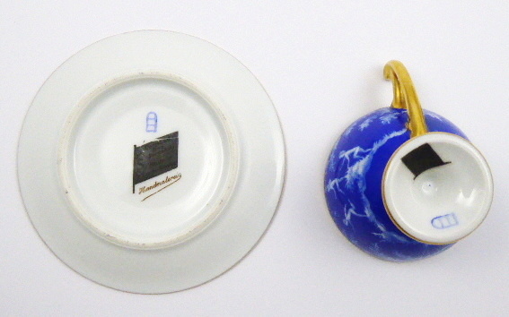 - F. SIMON, KARLOVY VARY, Československo, Karlovy Vary 1929 - 1938. Bílý, tmavě a světle modře ručně malovaný porcelán, zlacení. Tvar v empírovém stylu. Porcelánka Friedrich Simon, Karlovy Vary. Výška 5,5 cm, průměr podšálku 12 cm. Porcelánový šálek empírového tvaru s typicky vyvýšeným úchytem. Ručně zdobený na modrém poli světle modrou figurální, krajinnou i architektonickou výzdobou. Celozlacený vnitřek i úchyt šálku, silně zlacené linky na šálku i podšálku. Značeno zespodu: firemní tištěnou značkou, zlatou vlajkou s nápisem Carlsbad fine Porcelain, Made in Czecho-Slovakia, pod tím zlacený nápis Handmalerei.