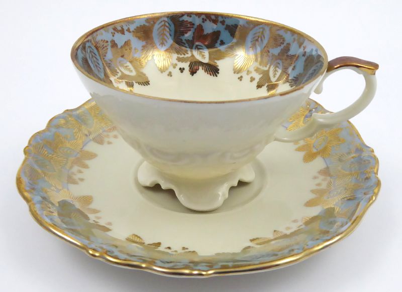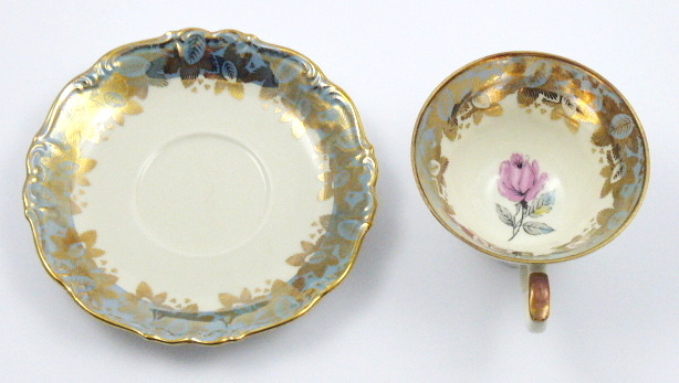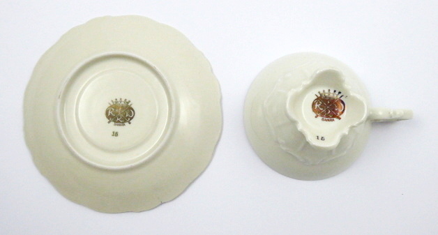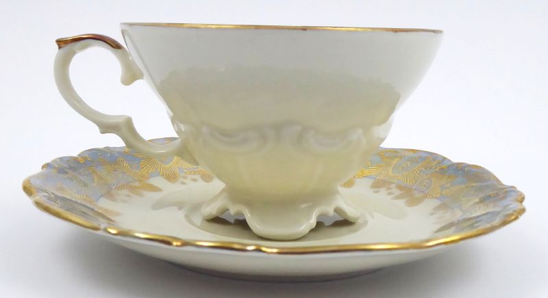 - RUDOLF WÄCHTER, KIRCHENLAMITZ Německo, Kirchenlamitz 1920 - 1930. Bílý, barevný a zlacený porcelán, perleť. Výška šálku 6,5 cm, průměr podšálku 15 cm. Reliéfně tvarovaný čajový šálek s podšálkem dekorovaný zlacenými florálními ornamenty na perleťovém šedomodrém pásu. Uvnitř šálku květ růže se stonkem a listy. Značeno zespodu: firemní značka a nápis Bavaria, zlacené číslo.