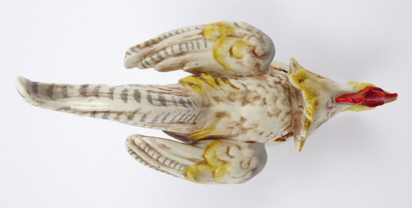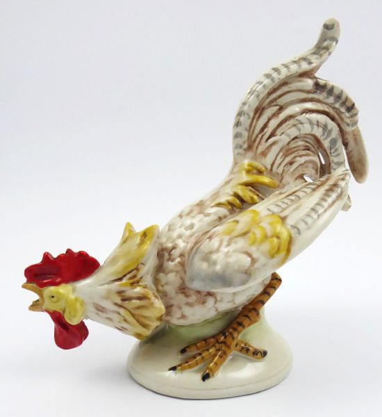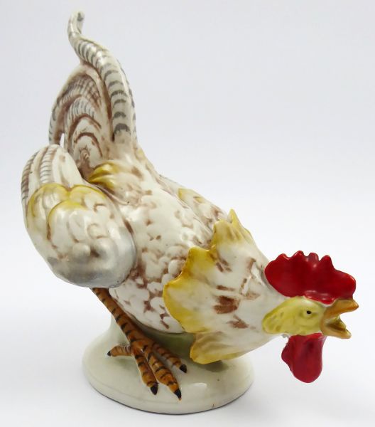 Německo, Gräfenthal, minulé století. Světlý a ručně barevně malovaný porcelán. Porcelánka Carl Schneider, Gräfenthal. Výška 19 cm. Figura pokrčeného a kokrhajícího kohouta ze světlého porcelánu s ručně malovanou perokresbou, nohama i hlavou kohouta s jasně červeným hřebínkem. Na nízkém podstavci mírně oválného tvaru. Značeno zespodu: vtlačená čísla a GERMANY.