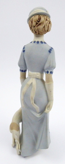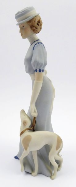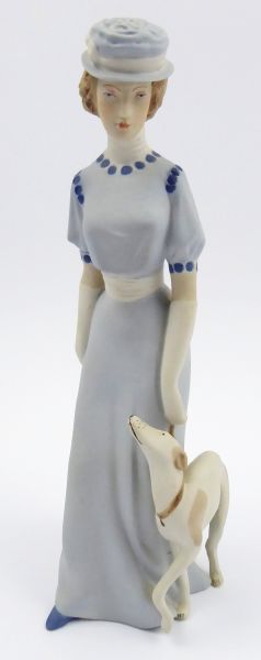DÁMA S MALÝM CHRTEM - ROYAL DUX, DUCHCOV Československo, Duchcov 1960 - 1978. Dekorativní, ručně barevně malovaná porcelánová figura. Autor návrhu: Vladimír David (nar. 1921) - absolvent pražské UMPRUM spolupracující s Royal Dux, Duchcov. Výška 24,5 cm. Dáma v klobouku, šatech a s rukavičkami venčící malého chrta. Značeno zespodu: firemní značka, vtlačená čísla, tištěná čísla a značka malíře.