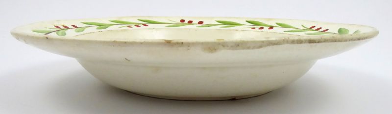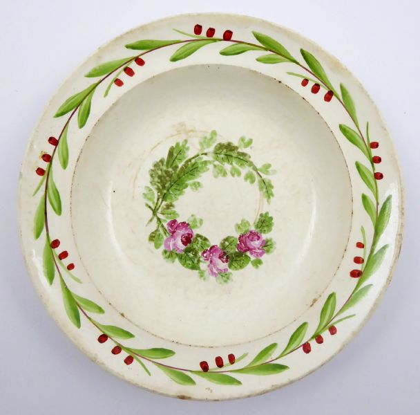 - AUGUST NOWOTNY, ALTROHLAU, Čechy, Stará Role (Altrohlau) 1828 - 1858. Jemná ručně barevně malovaná kamenina. Porcelánka Augustin Franz Nowotny, Altrohlau. Průměr 23 cm. Hluboký talíř z jemné kameniny dekorovaný uvnitř malým věnečkem z růží s listy a úponky a na okraji věnečkem z větvoví s červenými bobulemi. Značeno zespodu: vtlačené NOWOTNY IN ALTEN ROHLAU BEY CARLSBAD.