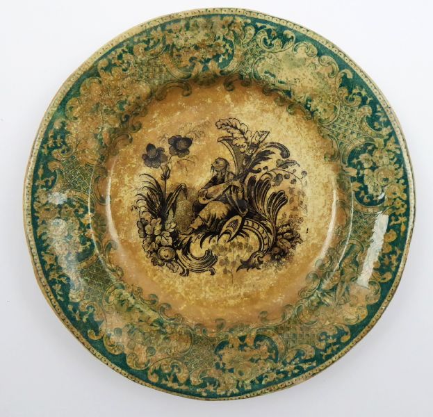 - AUGUST NOWOTNY, ALTROHLAU, Čechy, Stará Role (Altrohlau) 1869 - 1890. Jemná kamenina s černým a zeleným podglazurním tiskem. Výzdoba talířku vychází z chinosérií s romantickým nádechem. Porcelánka Augustin Franz Nowotny, Altrohlau. Průměr 19,5 cm. Malý talíř z jemné kameniny na okrajích bohatě zdobený zelenou bordurou s kartušemi, mřížkováním a květinovým ornamentem. Centrálním motivem je Číňan sedící uprostřed stylizované bujné zeleně a hrající na strunný nástroj. Značeno zespodu: vtlačená značka NOWOTNY ALTROHLAU.