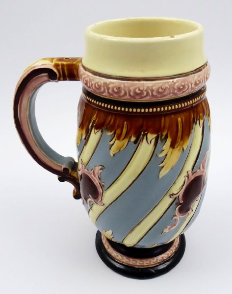 - RUDOLF DITMAR, ZNOJMO, Morava, Znojmo 1880 - 1900. Ručně malovaná keramika. Rudolf Ditmar, Znojmo. Výška 22 cm. Keramický korbel ze světlé keramiky zdobený na obvodu reliéfními kartušemi na těle barvy holubičí šedi. Dekorativnost korbelu podtrhují věnečky s florálními ornamenty a punktováním. Uvnitř korbelu ručně psaná značka: -1L, představující objem jednoho litru. Korbel zakončen kulatou nižší patkou. Značeno zespodu: nezřetelná vtlačená firemní značka a čísla.