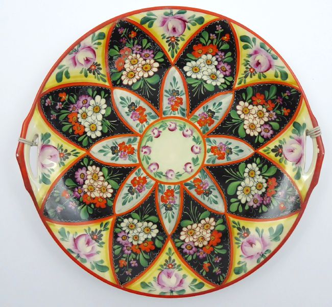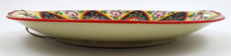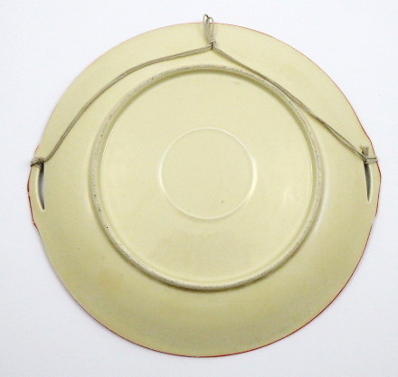 Československo, Kleneč pod Čerchovem 1920 - 1940. Ruční malba na jemné keramice slonovinové barevnosti. Zřejmě J. Milota, Kleneč pod Čerchovem. Průměr 28,5 cm. Větší závěsný talíř s postranními úchyty z jemné slonovinově světlé keramiky. Ruční malbou zdobený na zrcadle rozevřeným květem ze složených okvětních lístků uvnitř dekorovaných tradičními chodskými vzory. Uprostřed věneček z růžiček a větší květy růží lemují i okraje talíře. Otvory na úchytech slouží na závěs talíře. Neznačeno.