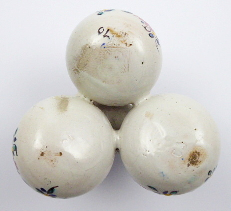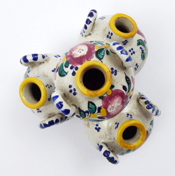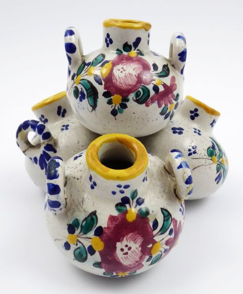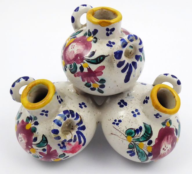 Západní Slovensko, Modra 1920 - 1944. Ručně malovaná fajáns. Tento soubor váziček pouze v jiné barevnosti je publikován v knize: Agáta Petrakovičová Šikulová - Slovenská lˇudová majolika v Modre v obrazové příloze na straně 114. Vydáno roku 2018 ve spolupráci s Muzeem Lˇudovíta Štúra v Modre. Výška 13 cm, průměr 13 cm. Fajánsová vázička, cibulka, složená ze čtyř nádobek kulového tvaru, kde tři tvoří základnu pro čtvrtou, jež je nahoře. Kulové nádobky s hrdélkem se žlutým okrajem a postranními oušky zdobenými modrým šrafováním. Dekorováno různobarevnými květinovými vazbami a punktováním. Slepované ouško u jedné ze tří váziček tvořících základnu. Značeno zespodu: vtlačené SK MODRA, čtverec a vtlačená čísla i psaná čísla.