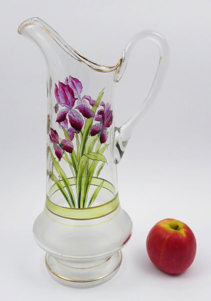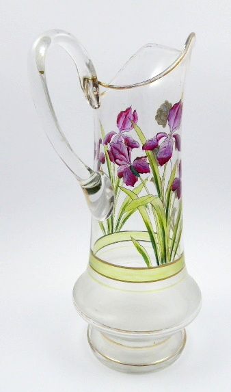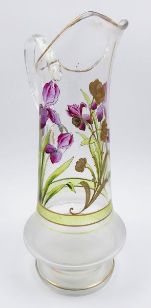 A ZLACENOU KVĚTINOU, Čechy 1890 - 1910. Čiré a matované sklo, ručně malované transparentními emailovými barvami, zlacení. Výška 37,5 cm. Vysoký džbán se střídajícími se plochami čirého a matovaného skla. Tělo džbánu je zdobeno pomocí transparentních emailových barev krásně ručně malovaným fialovým kosatcem doplněným o stylizovaný zlatý květ. Úzké zlacené linky.