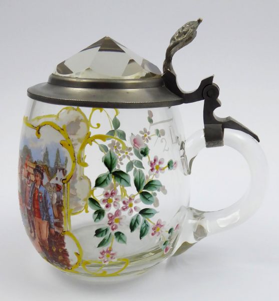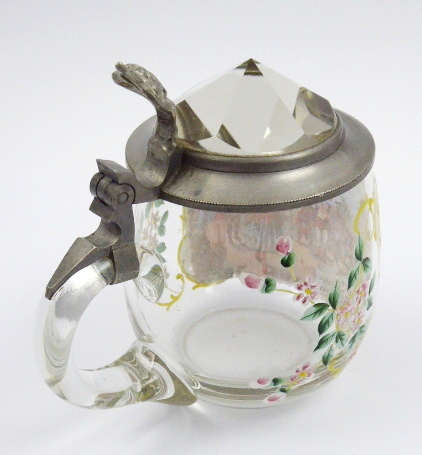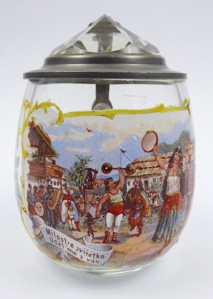 - MILOSTNÉ ZVÍŘÁTKO UDĚLÁME Z VÁS, Čechy 1900 - 1940. Bezbarvé sklo, barevně tištěné a emailovými barvami malované, cín. Výška 15 cm. Skleněný korbel s hlavním barevně tištěným motivem z duetu Jeníka a Kecala z opery od Bedřicha Smetany Prodaná nevěsta. Centrální výjev obklopují ručně emailovými barvami malovaná kvítka s listy. Cínové víčko s opěrkou na palec korunované skleněným krystalem.