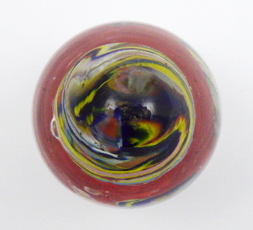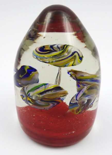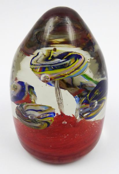 Čechy, Československo 1900 - 1935. Čiré a barevné sklo. Výška 12 cm. Skleněné těžítko ve tvaru homole s barevnými květy kulatého tvaru uvnitř a spodním polem v jasně červené barvě.