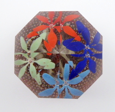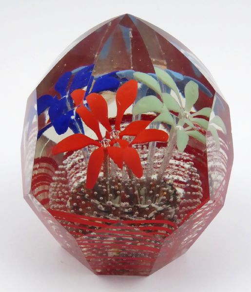 KVÍTKY A BUBLINKAMI, Československo 1920 - 1940. Ručně broušené čiré a barevné sklo. Výška 10 cm. Skleněné těžítko zdobené po obvodu ručně broušenými fazetami různých tvarů. Uvnitř barevná kvítka s korálkovými středy a ve spodní části pás bublinek. Oťuky po obvodu.